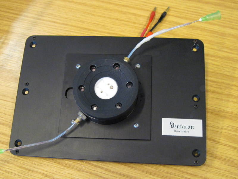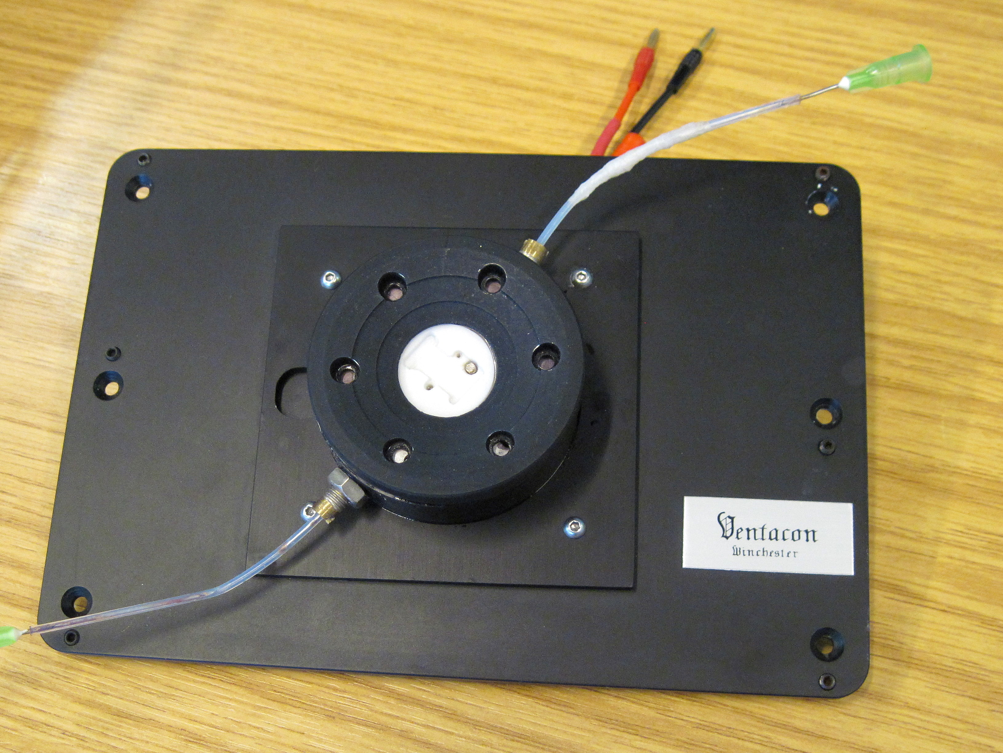 These cells are carefully designed to suit your requirements and Ventacon should be contacted directly to discuss your precise needs. A solution to your needs will then be designed and a quotation offered. An example of one of these microscope cells is illustrated below. It is used with a textured gold coated working electrode to provide SERS spectra from biochemical solutions as electrolytes.